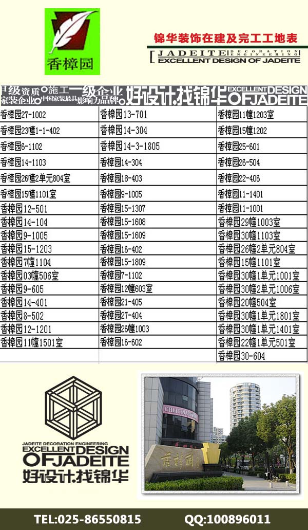 為了更好的讓香樟園的業主了解錦華裝飾的整個工藝流程,錦華裝飾仙林片區分公司整理了所有香樟園的完工及在建工地,歡迎大家來參觀。